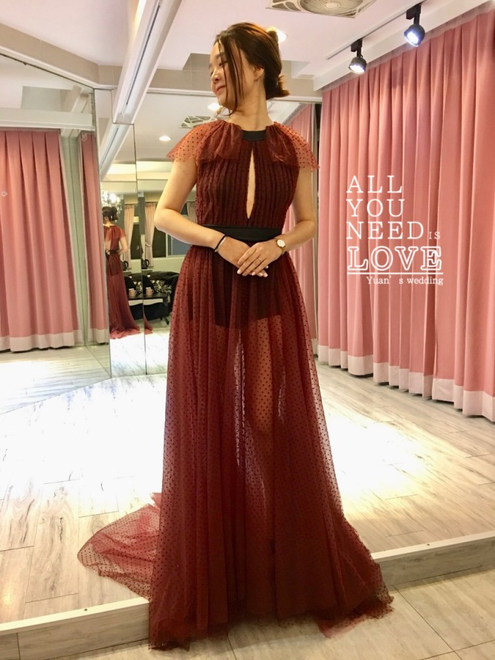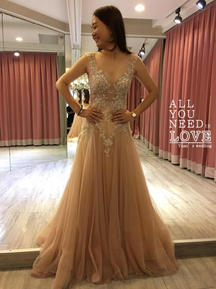 正面就參考下面,這套厲害到,我被路人問去哪裡找的禮服!所以我說Dionne的禮服真的很有特色,因為我沒胸部可以撐,只能找露腿的,但我又不想要傳統短禮服,Erin陪同幫我挑了這一件(真的是滿分)。能找出個人感的禮服,真的太棒了!