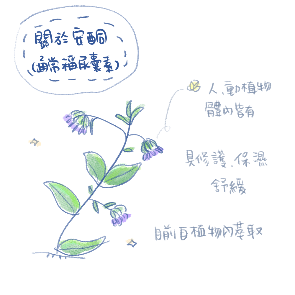 普遍大家常用的名稱為尿囊素(Allantoin),這個成分以前常用在修護治癒功效,存在於自然界的動植物體內,是一個生長增進劑。目前大部分由植物萃取喔!