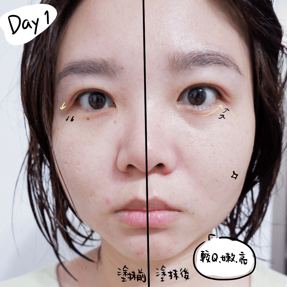 第一天我只塗半邊臉想測試看看有沒有什麼大不同。隔天,嗯,脫皮好像有減少一點,然後好像出油的情況減少了,其他我還感覺不太出來!(請大家忍耐看一下我的素顏)