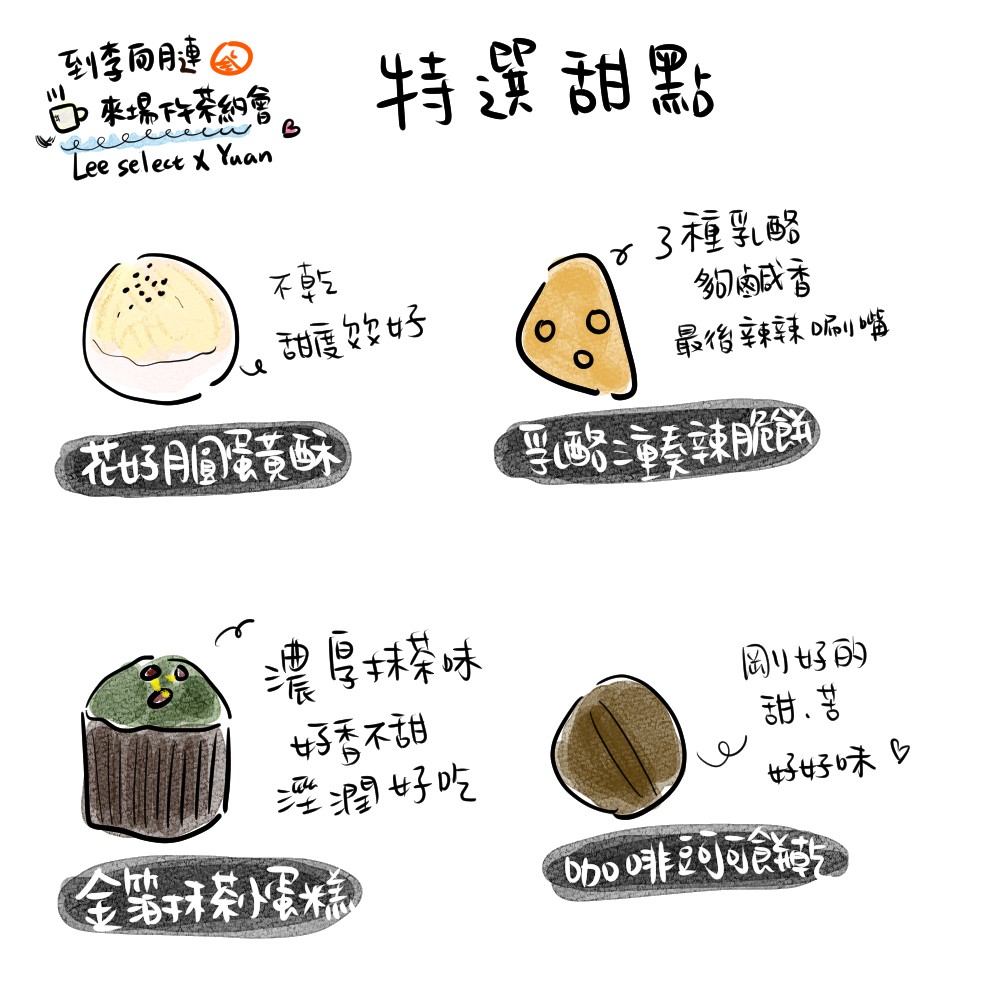 特選甜點-花好月圓蛋黃酥/金箔抹茶小蛋糕/乳酪三重奏辣脆餅/咖啡豆可可餅乾