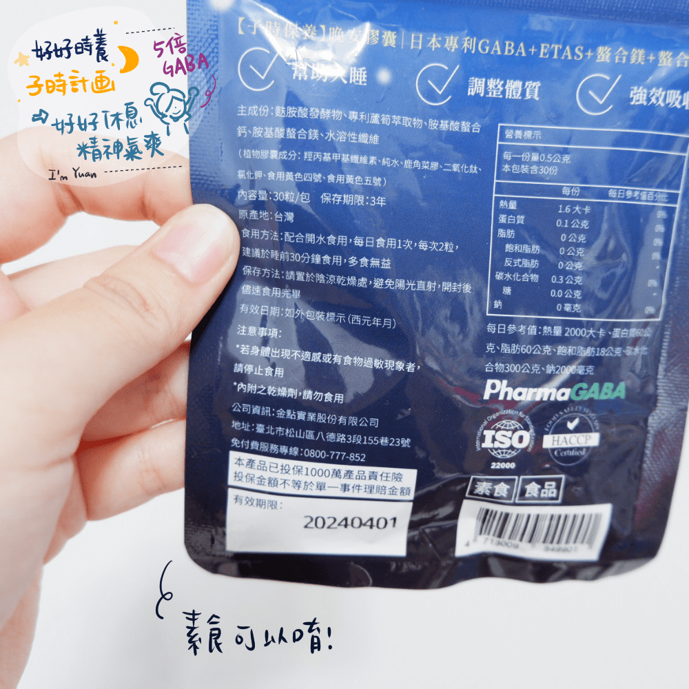 直到近期看到很多產品都含有GABA!被這個成分吸引!後來仔細看這個成分是體內重要的胺基酸之一,可以幫助入睡~而剛好看到子時計畫的晚安膠囊每一顆GABA含量達到250mg,整個超心動!