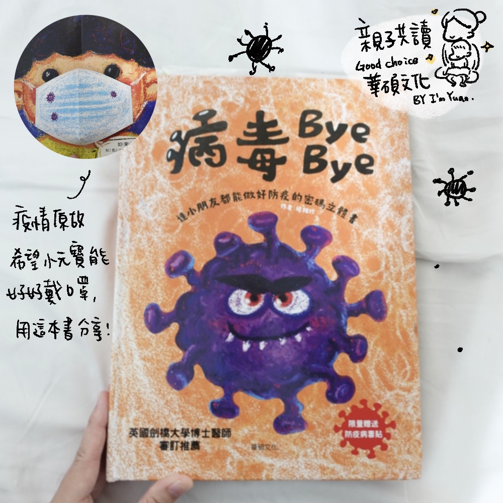 有陣子小元寶不愛戴口罩,各種抗拒,目前托嬰中心訓練。我也加強宣導!用書跟他說有病毒!而且可能因為是病毒書,顏色深,我覺得小元寶反應滿真實的,馬上說「怕怕」,這時候跟他說對啊,病毒很可怕所以要戴口罩喔!現在都蠻配合的。