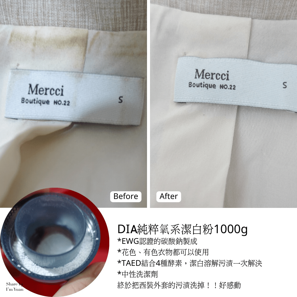 剛拿到這一瓶,我真的不知道如何使用,有天突然想到我的西裝外套有污漬(汗漬)一直洗不掉,我決定來用用看!結果我下午泡著,沒多久再去看!掉了掉了!那之前到底是怎樣啦,立馬被圈粉!