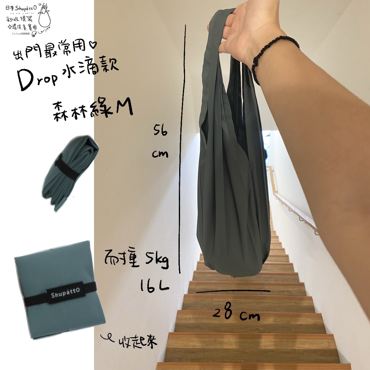 這是我近期最常帶出門的購物袋,因為折疊起來扁扁的,如果突然要去買東西、帶東西回家,我會馬上拿出來!而且我常常把這個購物包當包包帶出門!大小容量很剛好,可以肩背、可以手提。水滴狀真的很可愛很百搭!