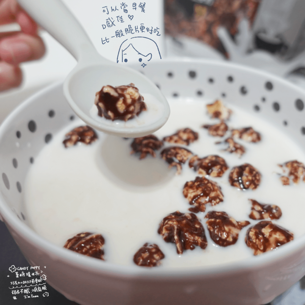 我覺得單吃就有夠好吃,但其實還有多種吃法,加入甜點、冰淇淋或是飲品等。我嘗試加入小美香草冰淇淋,真的有畫龍點睛欸,吃起來甜甜鬆脆!後來加到牛奶裡面!這比加一般的巧克力脆片更有口感,更不甜膩好吃,當早餐也超適合,連男子都愛上!