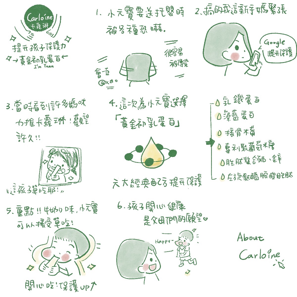 因為以前就在保養品公司上班,其實我有研究過寶寶營養補給,其中大家最常推薦就是初乳蛋白和乳鐵蛋白或是近期比較夯的藻精等等。其實市售產品成分都不會太差,就是針對需求、補給品價格、呈現方式來選擇自己所需要,而這款 #專利黃金初乳球蛋白 的特色擁有6大配方,給孩子全方位的保護力。正是小元寶很需要的啊!
