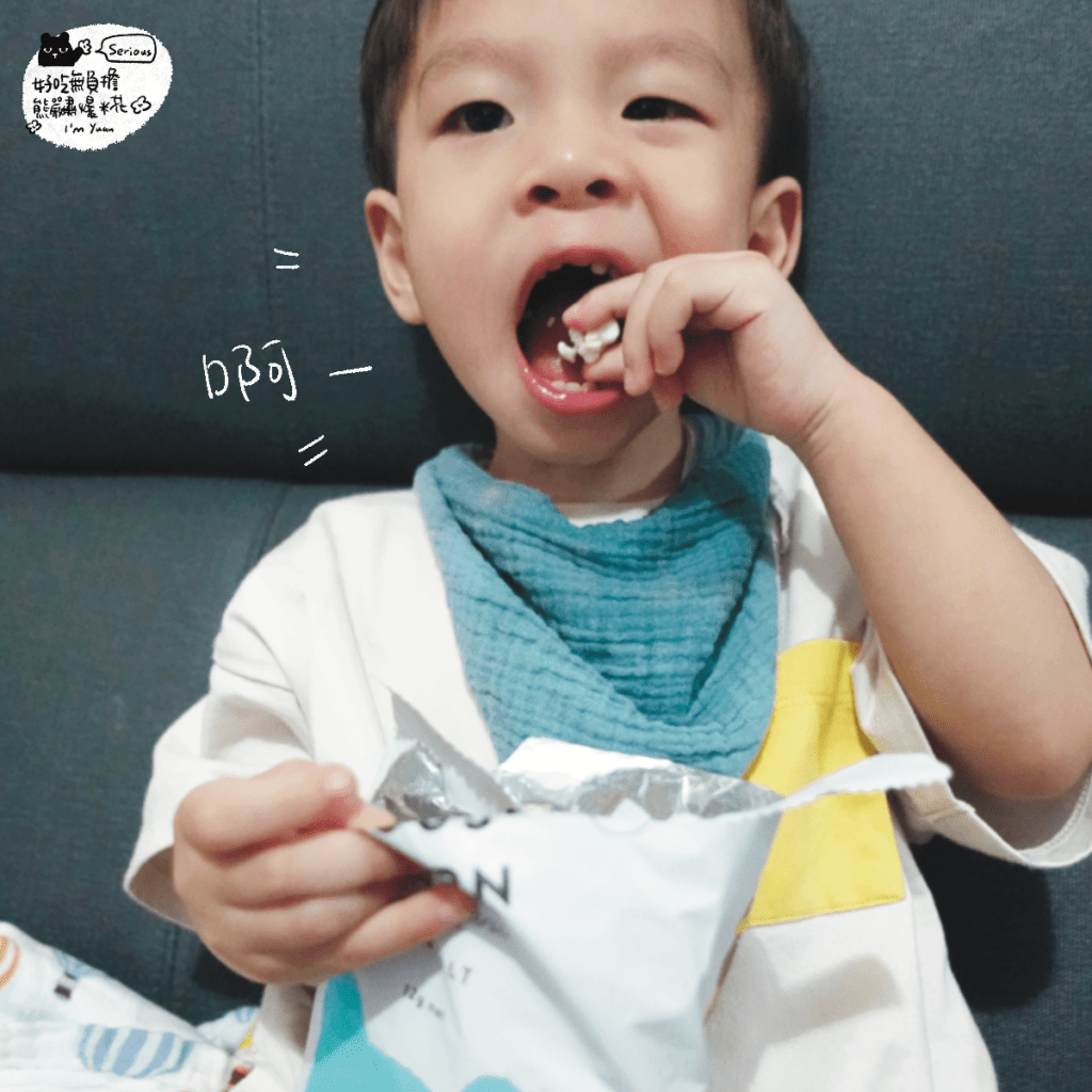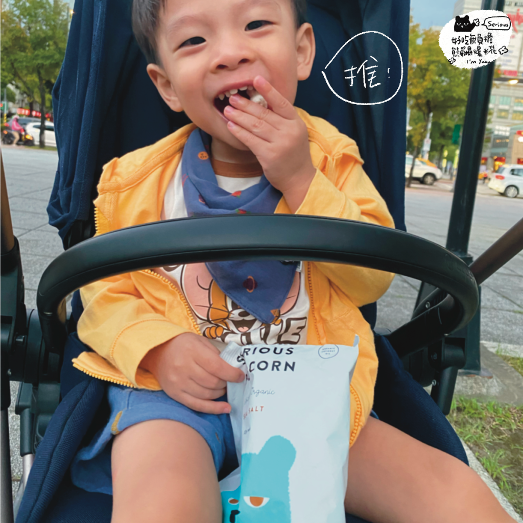收到後,馬上被小元寶拿出來,爆米花其實建議食用年齡是四歲以上,我自己評估是覺得小元寶有能力吐出硬硬的籽,而且他在吃的時候我也會請他坐著,就讓他先吃看看海鹽口味!結果他一吃愛上,我自己吃了一口,就像小時候吃得鹹爆米花!但是沒有油膩的味道~少了奶油的香氣,是簡單的玉米香~鹹度也不會很鹹~是起來淡淡的很唰嘴!有好幾次去接小元寶下課,就讓他坐在推車上邊吃嚴肅爆米花~他真的有夠愛!可以因為這樣乖乖坐在椅子上~