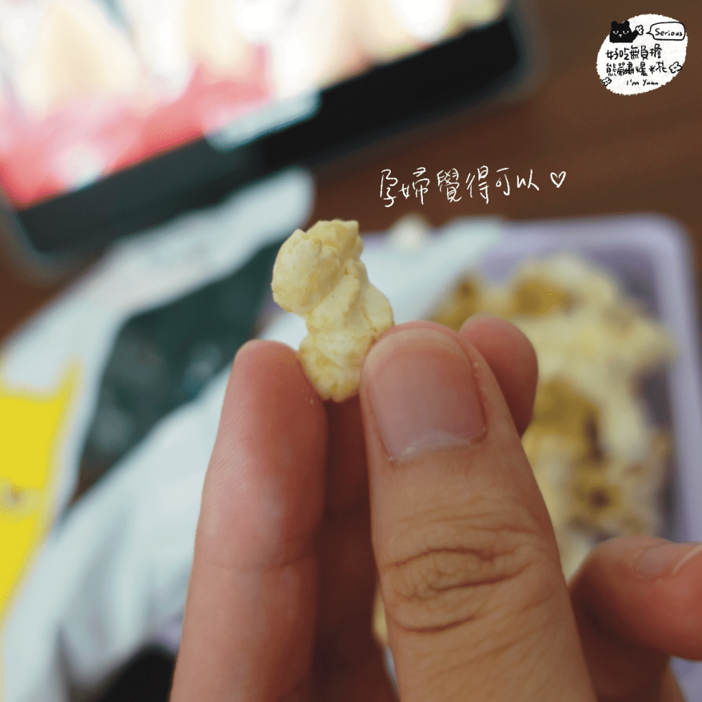 我以前也很愛吃電影院拿種奶油香氣滿出來的爆米花,長大後當然也知道吃太多不好,但又想解解嘴饞,尤其現在懷孕中(要控制體重),希望能吃一點熱量不要太高的,選這個剛剛好~而且小元寶也可以吃~他自己已吃完一小包!