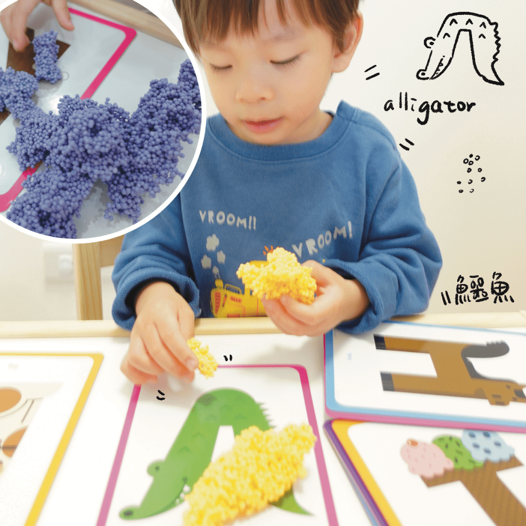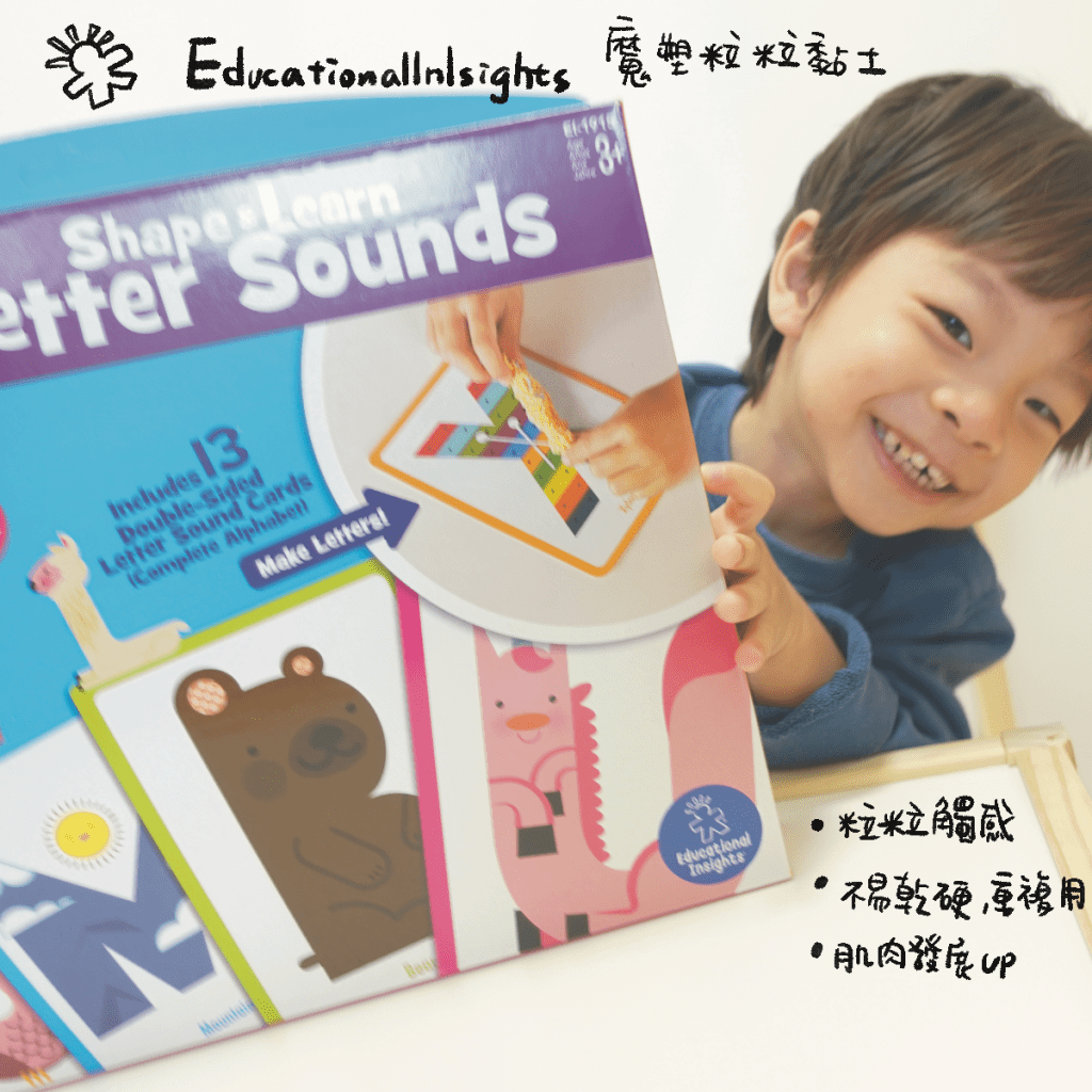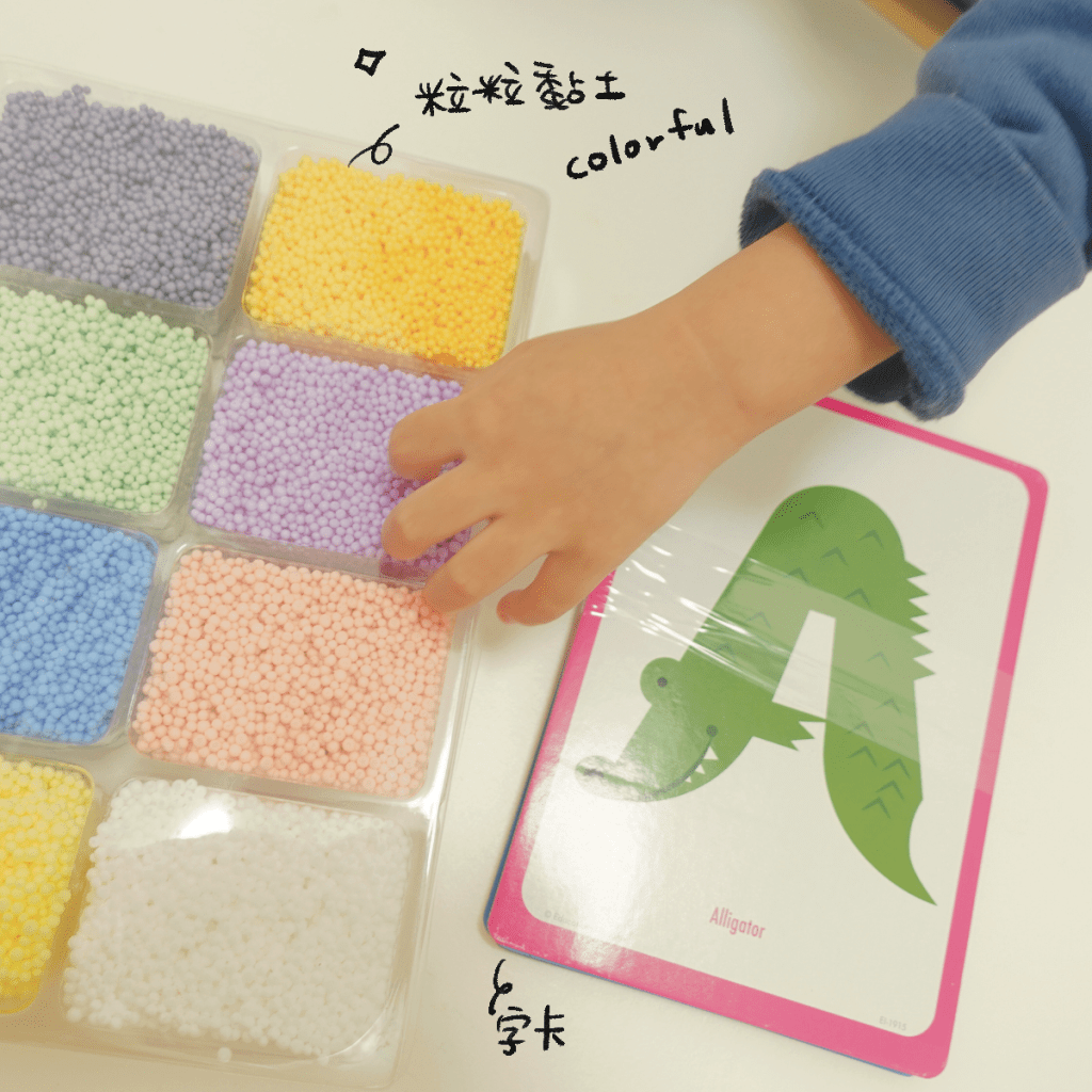 這一款我覺得是粒粒狀很特別,就很像顆粒狀的史萊姆,揉捏起來很特別,我也看過有媽媽拿來做壽司教具(超強),因為不會變硬、變乾,孩子可以任意捏出造型,不會沾手(但不要黏到毛類),我現在拿來讓小元寶放在英文字母上,我覺得讓他去鋪造型蠻好的~邊學字母邊練習手部肌肉!