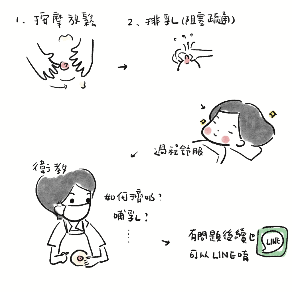 剛開始是親切的詢問目前的狀態,關於第幾胎、目前是否有哺餵等等。接下來就先看乳房的狀態,因為我已經有先親餵,也開始漲和有些微塞住,所以芙芙先幫我按摩疏通乳腺排奶!在這中間我們會聊一些之前哺餵的狀況,還有遇到的問題,芙芙也以自身的經驗(本身也是媽媽),還有遇過的案例跟我分享~中間也會一直告訴我一些母乳的小知識!