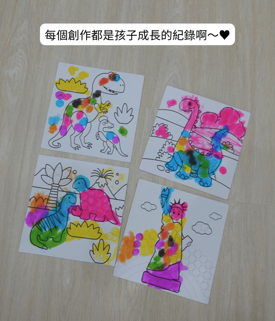 這是元寶第一組點點畫筆,他很開心拿來點畫,剛開始他不會,到後來自己挑色點在框框內,看他玩得很開心~媽媽我也好開心!而且還有QRCODE可以掃描下載圖案,不怕內附十張圖畫紙用完!讓孩子可以玩開心。