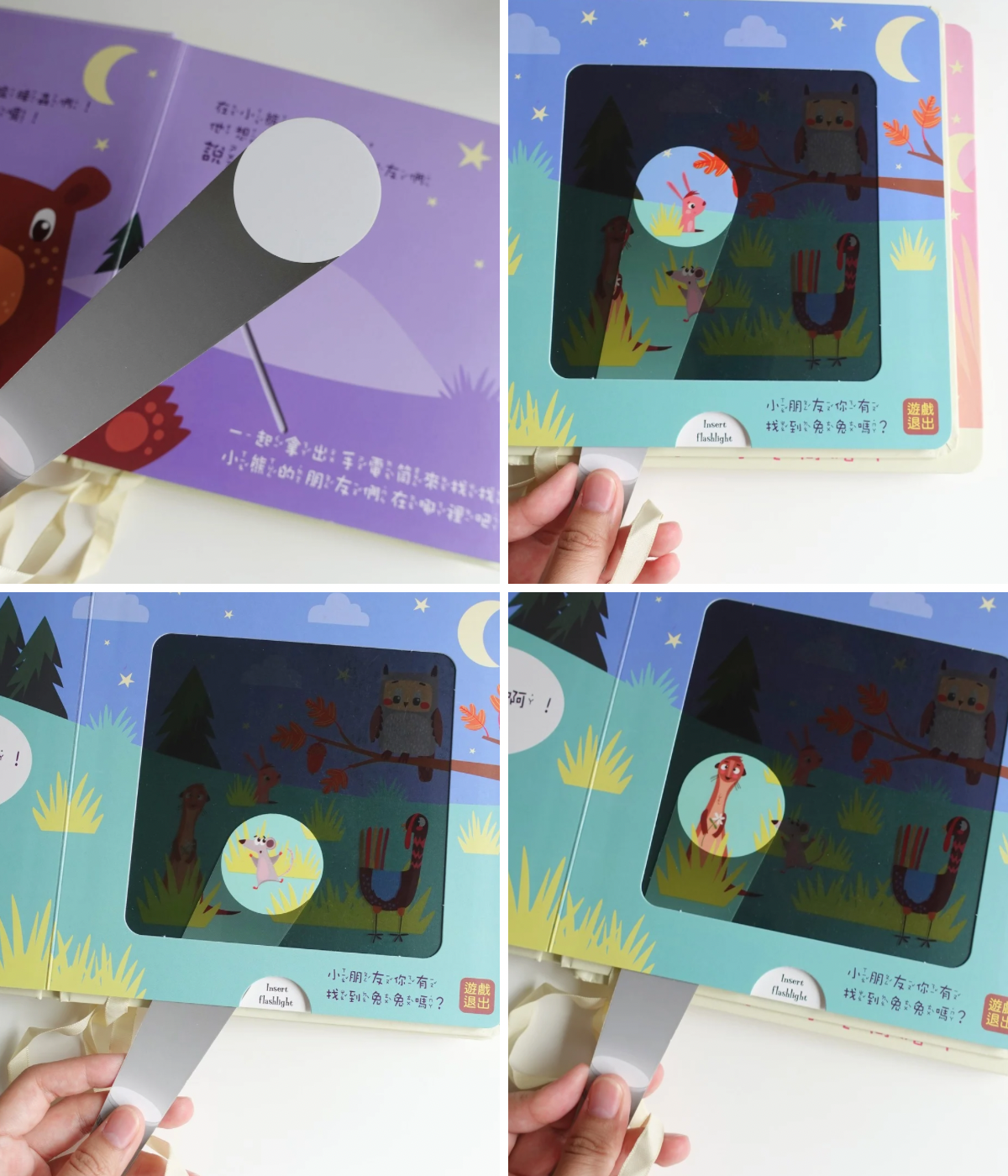 這本書,我第一眼看到就覺得很有趣,可愛的晚安書,搭配特殊設計手電筒,讓孩子用紙做的手電筒找出小動物,元寶第一次看到眼睛都在發光!看他閃閃發光的眼神媽媽我超開心~