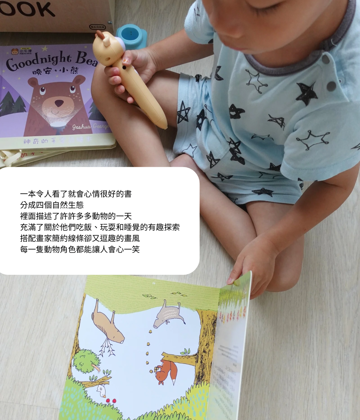 我覺得插圖很簡單,卻很可愛,藉由不同場景、不同動物、以及動物的習性等等來說故事,最後有簡單的互動遊戲。讓孩子不是只有閱讀,而是可以去思考去觀察!元寶偶爾會拿出來自己玩,讓我超開心!而且也有英文點讀,讓孩子不只學中文也能學英文。