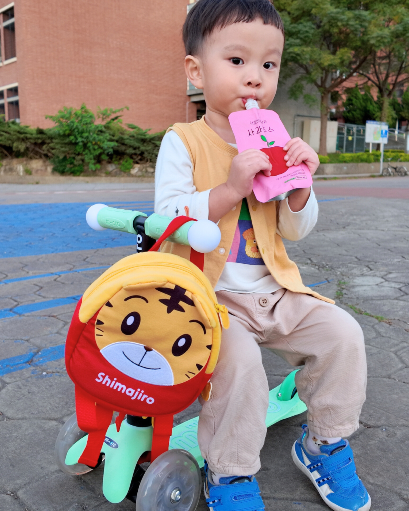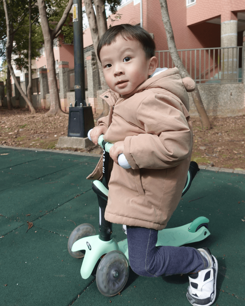元寶小的時候我買了一台它牌滑板車,很優秀~但是太小剛會走的元寶不太會滑,會需要我們大人幫忙推。但礙於當時那台滑板車沒有推桿,所以買來放了很久才給元寶玩~