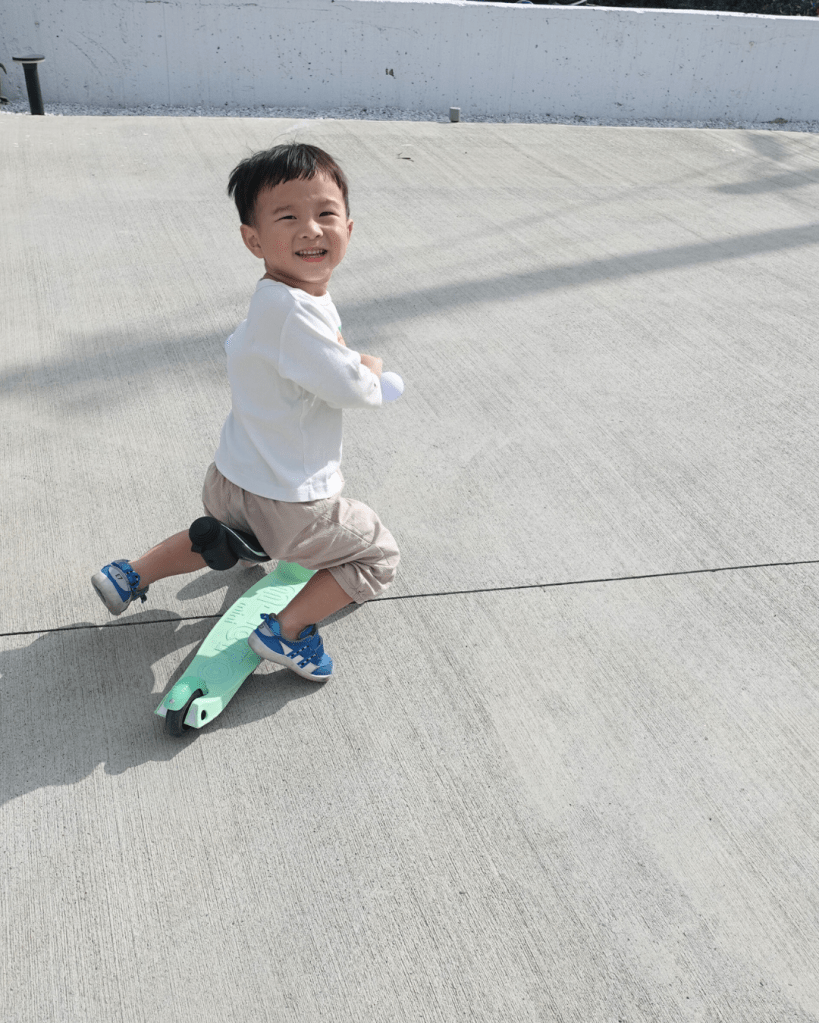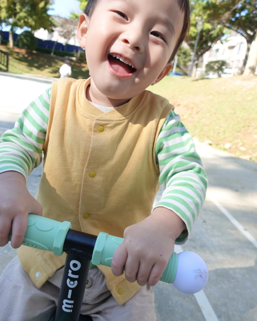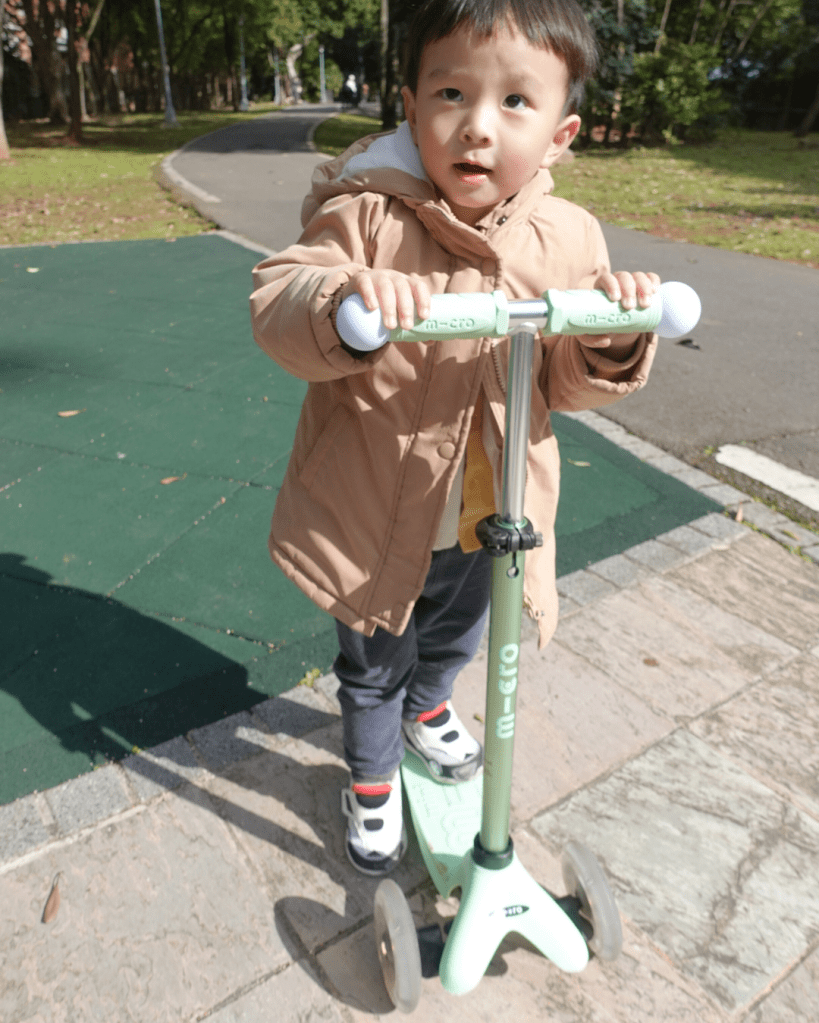 第一次給迷你寶玩,他很快上去就滑起來了,主要是因為Micro有獨家重心轉向設計,就算初學者也可以很好上手,看著他用奇妙的姿勢玩滑步車都會讓我不禁笑出來!